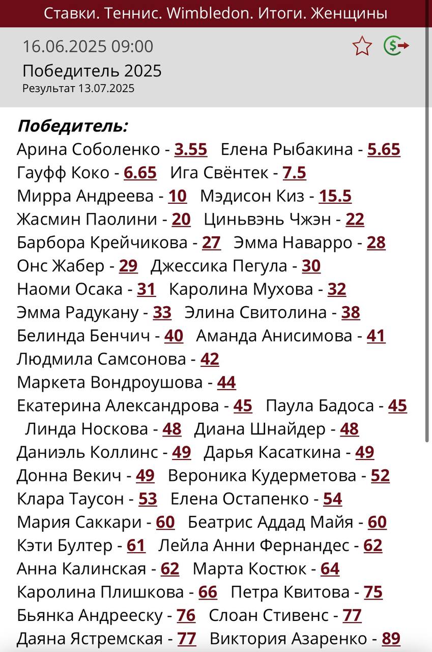 Коэффициенты на итоги Уимблдона-2025