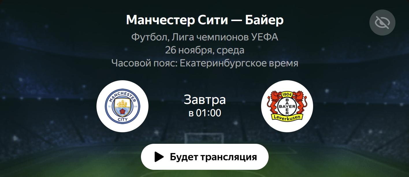 Матч «Манчестер Сити» — «Байер» состоится 26 ноября 2025 года в 01:00 по времени Астаны. Для зрителей в других городах и странах время начала будет следующим: в Москве — 22:00, в Минске — 21:00, в Лондоне — 18:00, по UTC также 18:00.