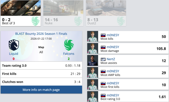 На Dust2 Falcons выглядели заметно увереннее. Команда быстро захватила контроль по темпу, а m0NESY раз за разом выигрывал дуэли и ломал попытки Liquid вернуться в игру. Liquid снова цеплялись за стартовые раунды, но решающие эпизоды уходили Falcons — итоговые 13:8 и чистая победа в серии.