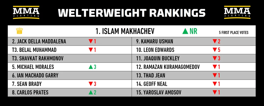 Отдельной интригой является выбор соперника для первой защиты титула Махачева. Моралес и Пратес подали весомые заявки, но россиянин публично назвал предпочтительным вариантом Камару Усмана, который идет девятым. Оба находятся под управлением одного менеджера, а сам Усман уже отреагировал и заявил о готовности к бою.