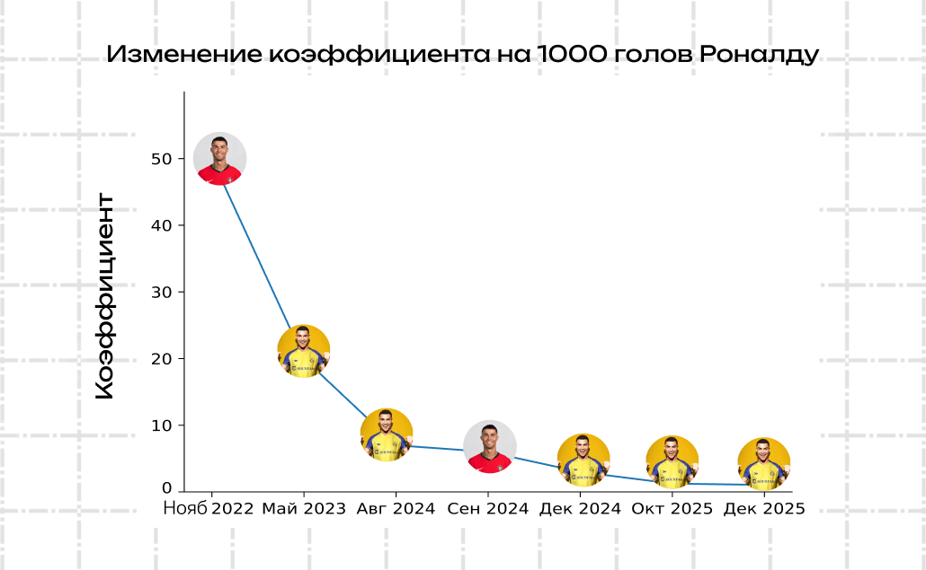 В октябре 2025 года вера аналитиков выросла до максимума: вероятность того, что Криштиану преодолеет отметку в 1000 голов, оценили примерно в 80%, выставив коэффициент 1.25 на успешный исход. Ставка на провал сценария шла уже существенно выше — 3.55.